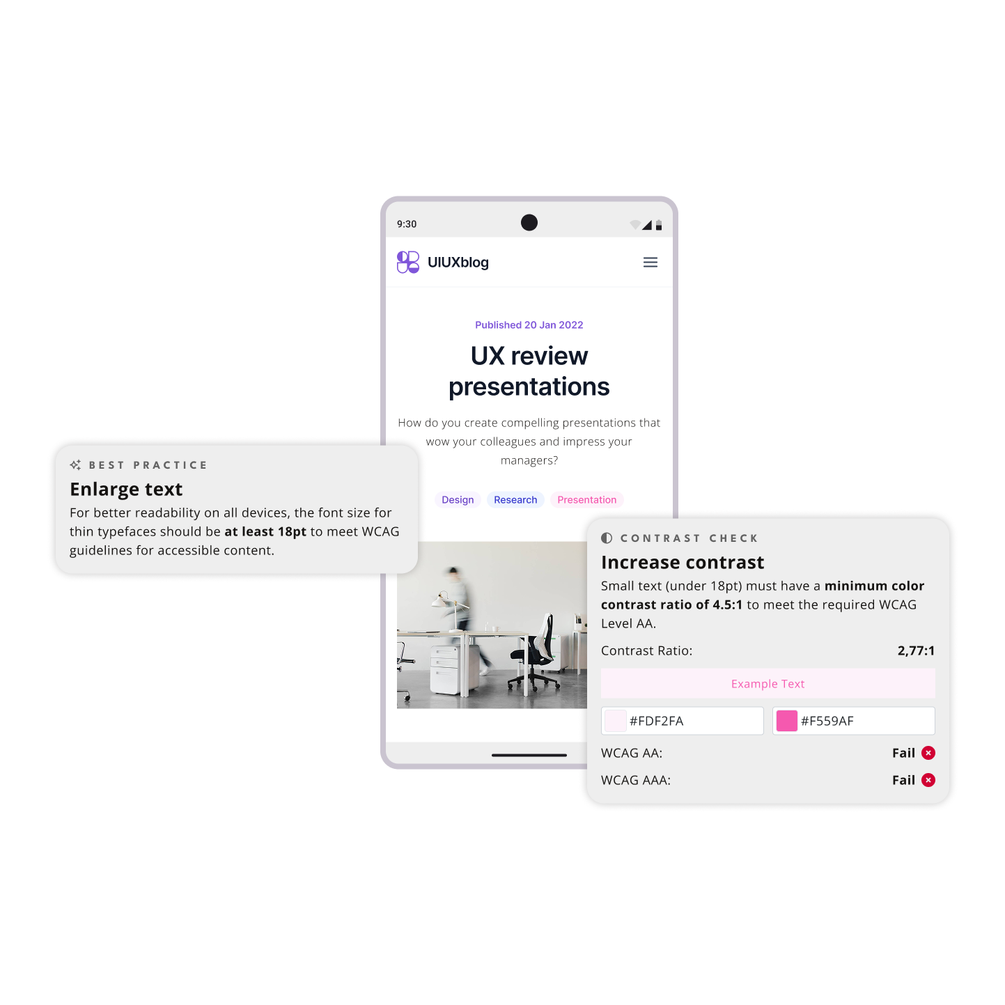 - Contrast ratios: Is the contrast sufficient for good readability?
