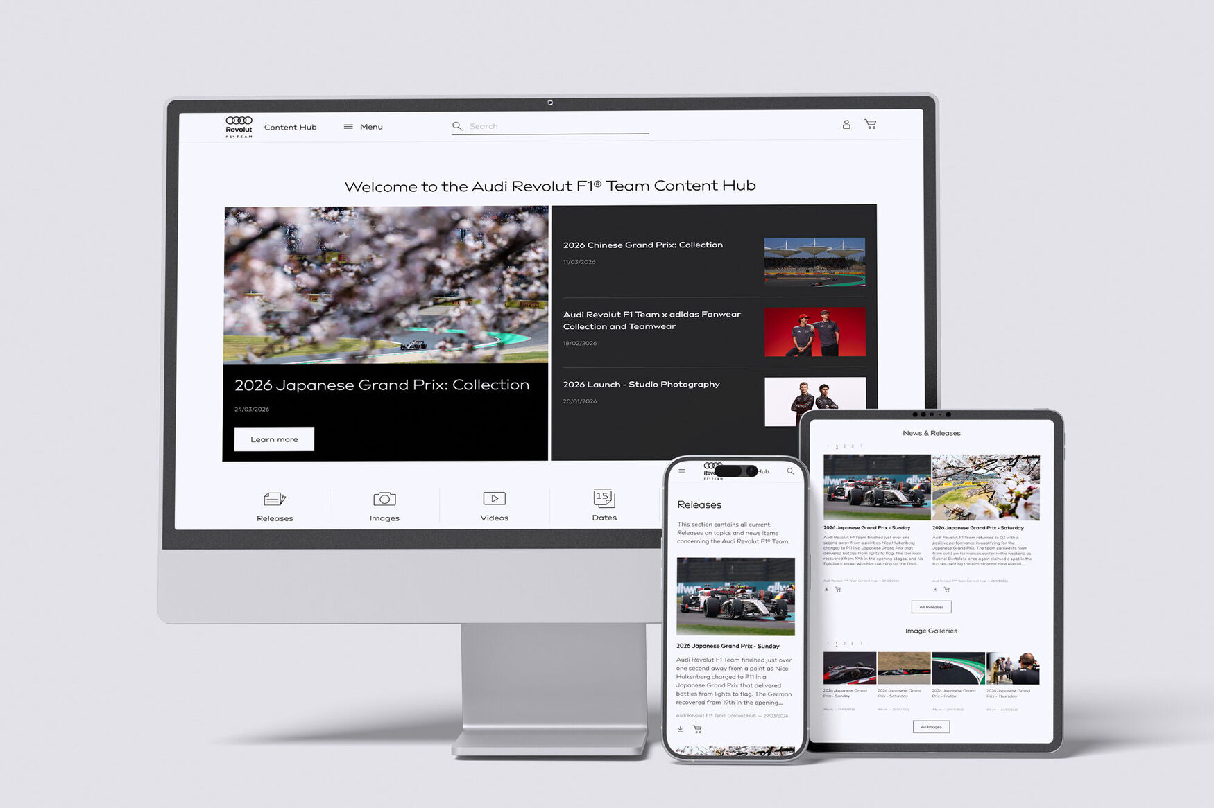 The Audi Revolut F1® Team Content Hub is Audi Motorsport AG’s central digital communication platform. To mark Audi’s entry into Formula 1, a platform was developed that enables journalists and other representatives from the media and the public to quickly and easily access press releases, press kits, images, videos, and other content.